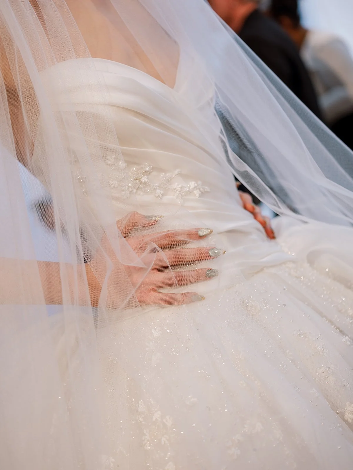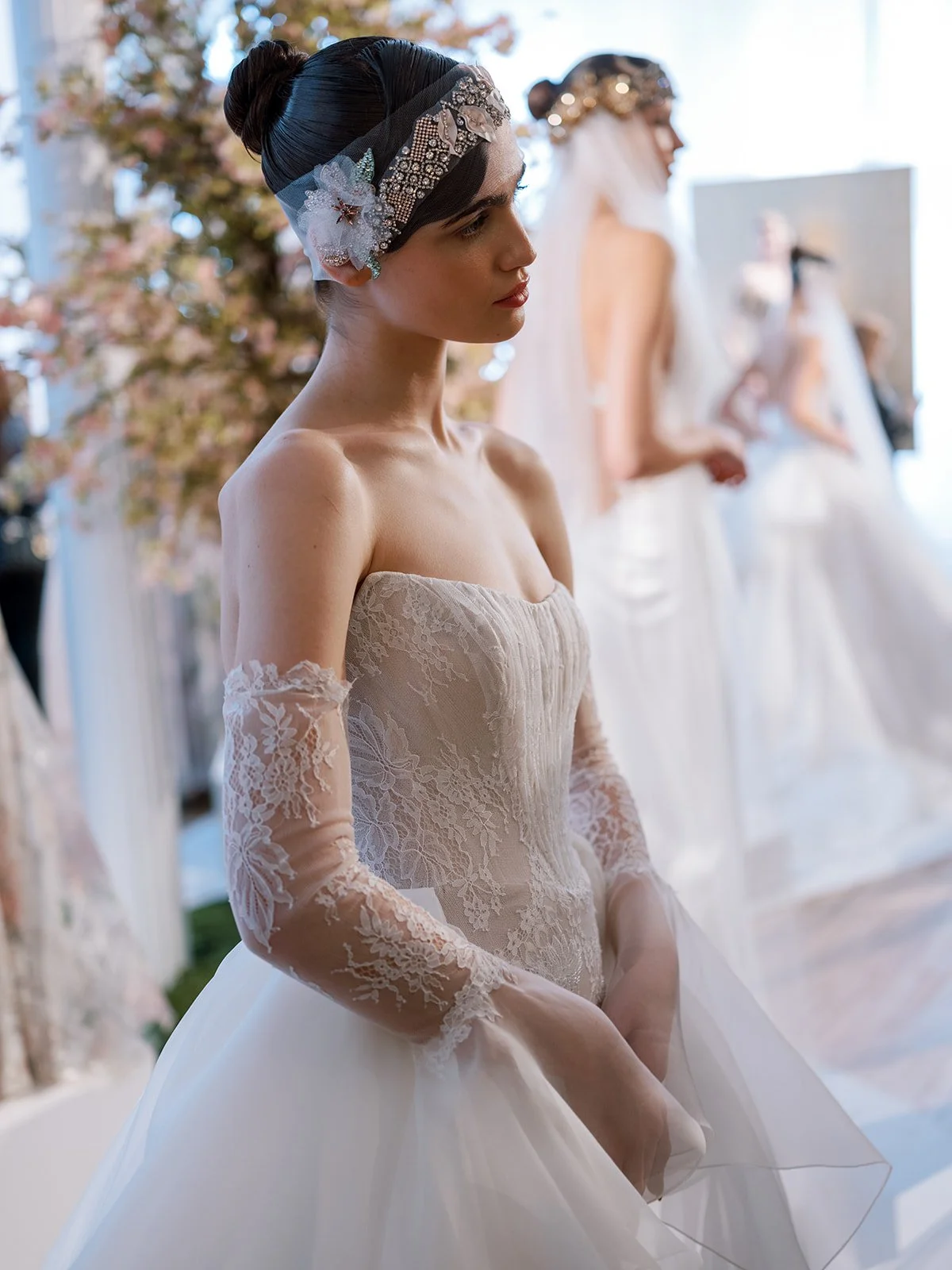 When we decide to invest in a particular dress, sometimes we modify it for style preference or modesty. Oftentimes we will remove a big floral that we don’t love or adjust the neckline to make it more modest. We love having the option of wearing the dress multiple different ways so we tend to lean into the matching sleeves and veils that the designer makes to go with the dresses. Not every wedding dress has matching pieces, but when they are paired nicely on the runway, we love going with the whole look! An example of this is the Chiara dress from Ines Di Santo. From our point of view, Chiara is best worn with sleeves and a matching veil.