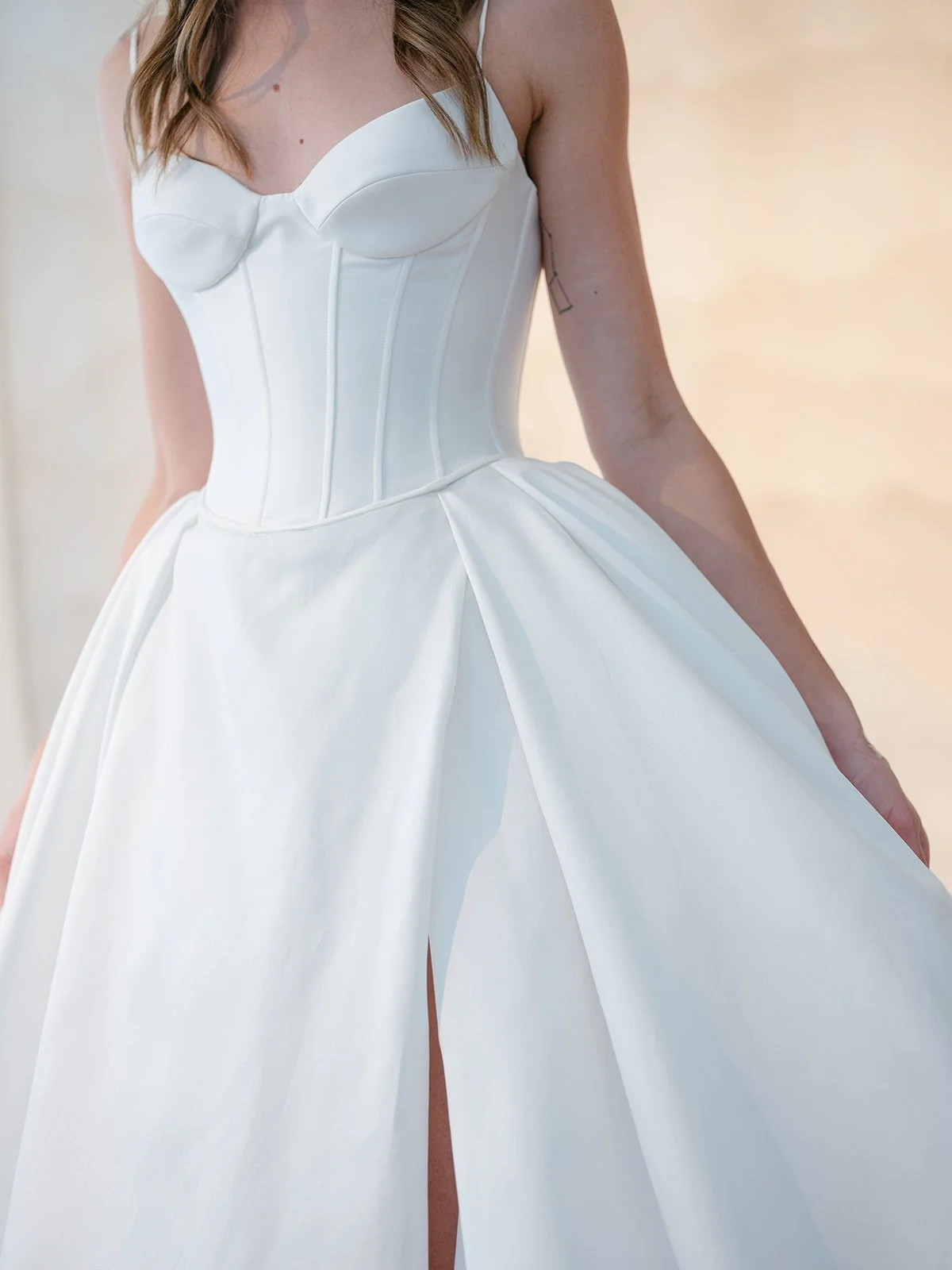 Your custom dress will come in with your closest dress size. It will still need to be tailored, hemmed, and bustled. It is customary to tailor your dress as every bride has a preference on how tailored they would like their dress to be. We will help you set up the best alterations plan to have the dress ready for your wedding day. Also, we will provide you with recommendations on day-of steaming.